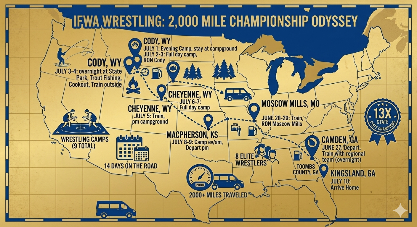 This summer, our HS wrestlers of IFWA have been handed a rare opportunity. We aren't just going to practice; we are embarking on a 14-day, cross-country intensive training tour. We will be traveling alongside the 13X State Champion Camden High School wrestling team, moving from the heat of Georgia to the high altitudes of Wyoming.